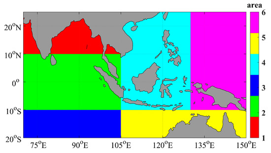 From Figure 5, it can be seen that the larger positive deviations are in the northern waters of Australia, and the smaller positive deviations are in the Bay of Bengal, the waters of western Western India, and the waters of southern Sri Lanka. The significant negative deviations are found in the southwest waters of the study area and the South China Sea. The smaller negative deviations are located in the northeast sea area of the study area. Based on the spatial distribution of deviations within the study area, the scope of the Southeast Asian seas was divided. The refined regional distribution corrected for HY-1C in this article is shown in Figure 7.