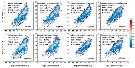 Based on the VIIRS SST data, the HY-1C SST was calibrated using methods of monthly average bias correction, different region correction, and temperature segmentation correction. The scatter plot of the comparison between the HY-1C SST (before and after correction) and Argo-measured SST is shown in Figure 8. All three correction methods improved the HY-1C SST data, but there were still significant errors. The effect of regional correction was the best, with the Std and RMSE close to 1 °C after correction, and the RMSE decreased by approximately 0.8 °C at night compared to before correction.