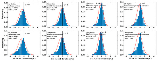 The statistical histogram of the deviation between the HY-1C SST and Argo-matching data before and after correction is shown in Figure 9. From Figure 9, it is observed that before the SST data correction, 82.44% of the daytime SST differences were within ±2 °C, 56.58% of the SST differences were within ±1 °C, and the proportion of data with SST deviations within the ±0.5 °C range was 32.57%. The nighttime SST data were worse than those during the daytime, with 78.9% of the SST differences within ±2 °C before correction, 53.23% within ±1 °C, and 30.86% within the ±0.5 °C deviation range. Through regional correction, the deviation distribution was more concentrated than before, with 92.79% of the daytime data deviation within ±2 °C, 72.14% of the daytime data deviation within ±1 °C, and the SST deviation within the ±0.5 °C range reaching 42.95%. For the nighttime SST, 92.3% of the data after regional correction had a deviation within ±2 °C, 72.59% of the data had a deviation within ±1 °C, and 45.74% of the data were corrected to within ±0.5 °C. The results indicated that the HY-1C SST had been effectively improved through regional correction.