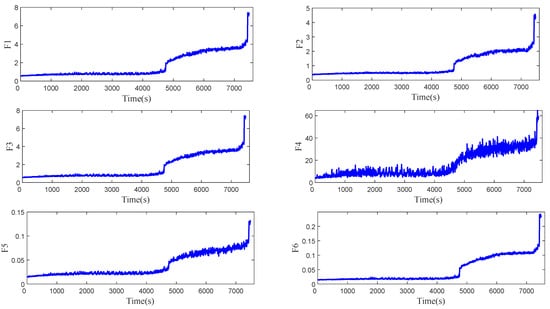 The data Bearing1_1 are selected and a total of 36 feature indexes in the time domain and frequency domain are extracted. According to the monotonicity, trend, and prognosis of the features, a total of 12 features of F1–F12 shown in Table 1 are selected, as shown in Figure 5. These 12 features are fused with reference to the ‘bearing degradation curve’ and normalized to construct HI. The HI curve is shown in Figure 6.