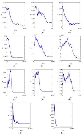 The initial values of the parameters of the dynamic state space equation and the predicted data parameters are set; the state of the state space model will be continuously updated and iterated according to the observation information. The experimental verification of 13 sets of bearing data in Table 2 is carried out. The HI is input into the state space model and the model parameters are updated by the particle filter method. The parameter update process of each bearing data is shown in Figure 7. It can be observed that the parameters gradually converge to a constant value over time.