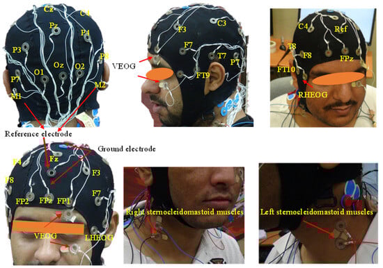 The EEG, EOG, and sternocleidomastoid EMG signals were acquired and amplified at a sampling rate of 1000 Hz with the help of a brain vision recorder system (Brain Products GmbH, Germany). The contact impedance between all electrodes and the skin was kept under 20 kΩ. Electrode impedances were adjusted before raw data collection by filling the electrodes with electrolyte gel. Electrolyte gel was applied by syringe to create a stable electrical connection between each electrode and the scalp. The raw EEG data contains artifacts that have non-neural origins and are usually the result of eye movements, eye blinks, jaw movements, and muscle movements. The recorded EEG signals were initially inspected visually for these suspicious artifacts and then preprocessed using EEGLAB []. Afterward, power line noise and other high-frequency noise were eliminated using a low-pass four-pole elliptic filter with a cut-off frequency of 50 Hz. Then an independent component analysis filter (ICA) was applied to identify and eliminate the noise and reconstruct the lost data using a spatial mixing matrix under the assumption of volume conduction [,].