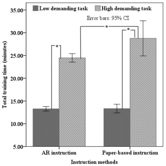 The result of the mixed ANOVA revealed that there was a significant main effect of task complexity on the total training time (p < 0.05). The training time for maintenance tasks varied significantly, with a considerable rise from the low-demanding (mean = 13.37 min) to the high-demanding (mean = 26.62 min) tasks, regardless of the instruction methods. Furthermore, the training time was significantly affected by the interaction between instruction methods and task complexity (p < 0.05). Based on simple effect analysis (Figure 6), the results revealed that the training time during the high-demanding task was significantly higher than the low-demanding task in both the AR-based instruction method (24.48 vs. 13.30 min; p < 0.05) and the paper-based instruction method (28.76 vs. 13.36 min; p < 0.05). Additionally, the results revealed that for the highly demanding task, the completion time for the AR and paper-based instruction groups was significantly different (24.48 vs. 28.76 min; p < 0.05). The AR group also finished the task with low demand more quickly than the paper-based instruction group (13.30 vs. 13.36 min), but no statistically significant difference was found (p > 0.05). The most important result of this analysis is that performing a highly demanding task using AR instructions decreased training time.