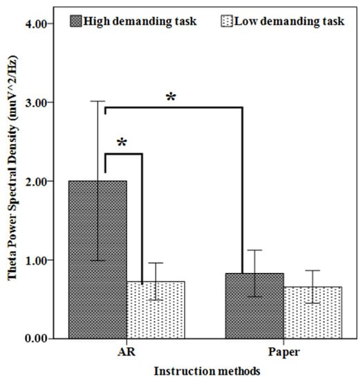 The statistical results shown in Table 3 revealed that the main effect of the instruction method was statistically significant on θ power for central and parietal regions (p < 0.05). The θ power at the central and parietal regions was found to be increased during the AR-based instruction task as compared to the paper-based instruction. However, the θ power at the frontal, occipital, and temporal regions was found to not be statistically affected by the instruction method (p > 0.05). The main effect of task complexity was statistically significant on θ power for the frontal, central, parietal, occipital, and temporal regions (p < 0.05). The θ power was found to increase as task complexity increased from a low to a high-demanding task for all regions of interest, regardless of the instruction methods used. For the interaction effects, the statistical results revealed that there was a significant interaction effect of instruction method and task complexity on θ power only at the parietal region (p < 0.03).