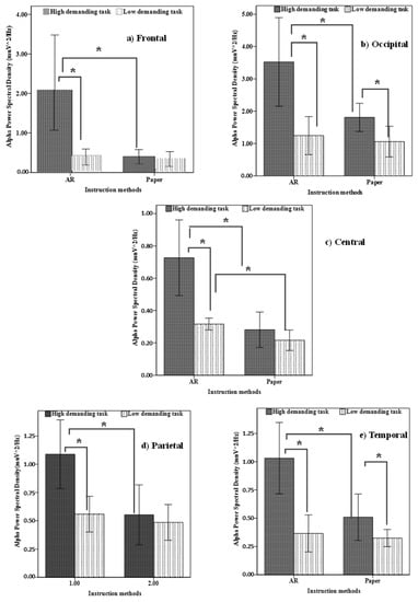 Further analyses were performed using paired t-tests and independent t-tests to investigate the differences in α power across task complexity and instruction methods for all regions of interest (Figure 8). For the AR method, the α power during the high-demanding task demonstrated significantly larger values than during the low-demanding task and during the high-demanding task of paper-based instruction across all regions of interest (p < 0.05). In addition, for paper-based instruction, the α power of the occipital and temporal regions for the high-demanding task increased significantly relative to the low-demanding task but remained approximately the same over the frontal, central, and parietal regions. Furthermore, the α power at the central region for AR groups was found to be significantly increased relative to paper-based instruction during the low-demanding task.