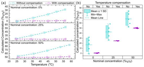 | Etched FBG [6] | No | 3.6 pm/%V/V 7.2 pm/°C | 0–80%V/V 3 & 20 °C |
