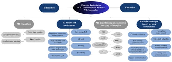 In this paper, we cover various aspects of 6G networks, especially those related to implementing emerging technologies. As shown in Figure 2, the rest of this paper is structured as follows. A comprehensive discussion of the visions and requirements for 6G networks is outlined in Section 2. Then, we provide an overview of the ML algorithms in Section 3. Additionally, we furnish comprehensive details on the ML algorithms deployed for emerging technologies in Section 4. Furthermore, we examine the potential challenges that future wireless communication may encounter concerning the requirements for 6G networks, as well as several insights for future research opportunities in Section 5. Finally, Section 6 presents the conclusions of the paper.
