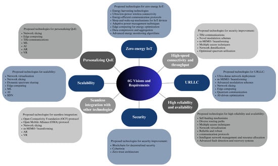- In the beginning, we provide comprehensive details of the visions and requirements for 6G networks. We point out several critical requirements for 6G networks, including zero-energy Internet of Things (IoT), high-speed connectivity and throughput, URLLC, high reliability and availability, security, seamless integration, scalability, and personalizing quality of experience (QoE).
