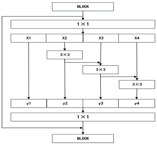 Multi-scale feature learning methods differ from fixed-scale extraction methods. The multi-scale module excels at extracting image information from diverse dimensions, improving the efficiency of image denoising. Based on this, Res2Net proposes a multi-scale module built inside the residual block to form receptive fields of different sizes and obtain different fine-grained features. As shown in Figure 1, after the image information passes through the 1 × 1 convolutional layer, the image’s feature information is segmented into s subsets, where s is the number of subsets into which the feature information is divided. The segmented image information is represented by , where every part is the same size. But the number of channels is 1/s of the input feature map of the previous layer, where each part has a corresponding 3 × 3 convolution, represents the 3 × 3 convolution, and represents the output of multi-scale feature learning methods. Each part is fused with each other after passing through different convolutional layers, and finally, the network will learn image information from different scale dimensions. As shown in Formula (1), the information of the image is represented by . Further information is learned and represented by after Res2Net extracts the image information .