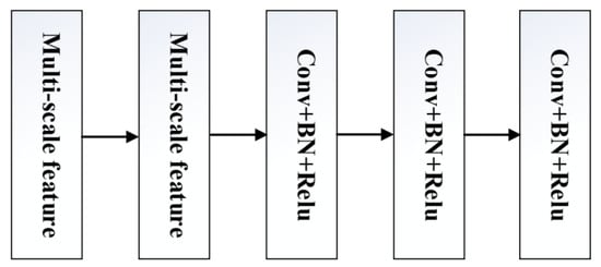 The information of the image is then transmitted to the second and third layers of ResNetConv+BN+ReLu (convolution layer + batch normalization + activation function), and finally, FL outputs information, represented by . , , and represent the output of ResNetConv+BN+ReLu (convolution layer + batch standardization + activation function) of the first, second, and third layers, respectively, namely: