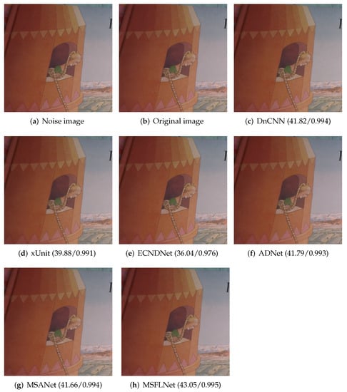The data sets used by the algorithm are Train400 [], DIV2K [], and SIDD. Train400 is 400 pictures in the Berkeley segmentation data set. The data set contains 400 clear grayscale pictures of 180 × 180. The pictures are rich in content, including various types of animals, landscapes, faces, and more. To improve the denoising performance of our algorithm, 800 pictures in the DIV2K dataset are selected as part of the dataset. The DIV2K dataset is a relatively common dataset in the field of super-resolution reconstruction. In order to facilitate training, it is scaled to a 180 × 180 size picture, and the data set is expanded by flipping the data set by 90°, 180°, 270°, and zooming. In order to train our MSFLNet algorithm model, the model trains Gaussian noise with noise levels of 15, 25, and 50, sets a patch size of 40 × 40, and finally, we generated 715,200 patches for image noise training. For real noise denoising, The algorithm selects the SIDD dataset. SIDD is a smartphone image denoising training set that includes paired clean and noisy images. We chose 140 images and cut them to 1024 × 1024 in size. We expanded the dataset by performing data augmentation on those images in order to increase the dataset.