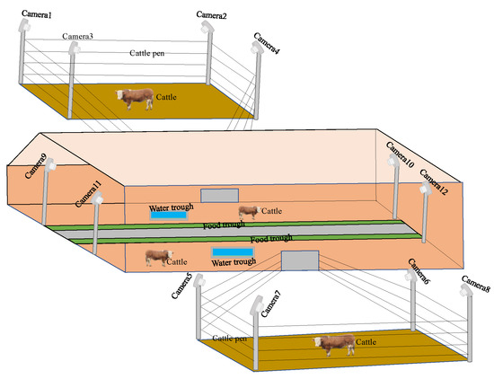 The study and experiments were conducted at a ranch located in Yuanyang County. The experimental subjects consisted of 50 mature Simmental cows. The barn was partitioned into a dual area configuration, with a cattle pen serving as the separation. On either side of the pathway, troughs were positioned, while, within the cattle’s resting area, a water trough was situated. The barn itself reached a height of 8 m, and cameras were strategically placed 2.8 m above the ground at each trough’s extremity. These cameras were inclined at a 45° angle to facilitate cattle detection. The bedroom’s entrances on both sides were connected to the cattle yard via cattle fences. This cattle yard was enclosed by further cattle fences. Four cameras were strategically installed in the corners, positioned at a height of 3.5 m from the ground. These cameras were also set at a 45° downward angle to observe the ground. The deployment sites of the cameras are visually represented in