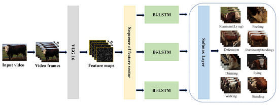 Figure 2 is the comprehensive framework underpinning the behavioral recognition of beef cattle within intricate environments. The initial step involves importing video files procured from the cattle farm into the OpenCV library, where a dedicated function reads these cattle-related video files. A loop is subsequently defined to meticulously process images frame by frame from the video, generating a series of n video frame images. These images are then subjected to processing through the Visual Geometry Group Network (VGG)16, extracting both corresponding feature maps and feature vector sequences. The subsequent classification procedure is facilitated by the Bi-LSTM framework, with the Softmax function employed for the completion of the classification task, yielding probability scores for each behavioral category. This meticulous approach enhances the precision of cattle behavior classification. Ultimately, the image classification task is seamlessly concluded.