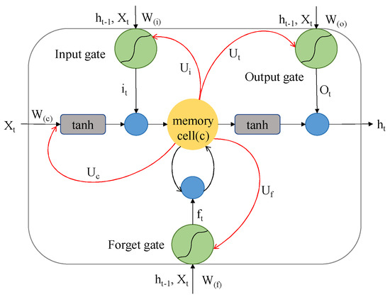 The input gate assumes the responsibility of moderating the degree of incorporation of fresh inputs into the memory cell. This gate operates through a sigmoid function to ascertain the significance of each input. Concurrently, a tanh function is employed to generate potential candidate vectors, facilitating the update of values within the memory cell. The function of the forgetting gate pertains to the determination of information that necessitates erasure from the memory cell. By employing a sigmoid function, which considers inputs and the prior moment’s hidden state, this gate yields a value within the 0 to 1 range. The output gate is entrusted with discerning the segments of the memory cell to transmit to the subsequent moment’s hidden state. The computation of the LSTM process adheres to the principles outlined as shown in Equations (1)–(5).