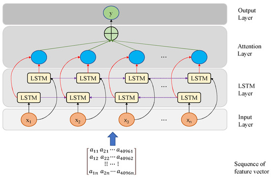 has the same number of timesteps after being used as the input. Our approach involves two key aspects. Firstly, we meticulously regulate information flow and memory updates through the LSTM layer, encompassing bidirectional LSTMs that amalgamate both forward and inverse outputs. Subsequently, the addition of an attention mechanism module within the attention layer elevates our methodology. Within this module, each LSTM output corresponds to an attention unit, effectively introducing a weighted processing mechanism for the Bi-LSTM output. This strategy effectively concentrates the model’s attention on the most pertinent temporal segments, thereby enhancing the accuracy and robustness of the cattle classification task. Finally, the output layer yields the weighted output vector, denoted as ‘y.’ The configuration of the Bi-LSTM architecture is visually presented in
