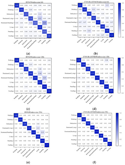 Confusion matrix for classification accuracy of eight cow behaviors. Figure (a,c,e) represent the accuracy of RNN in different windows, and figure (b,d,f) represent the accuracy of CNN-Bi-LSTM in different windows.