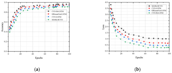 Comparison chart of experimental results: (a) accuracy comparison; (b) loss comparison.