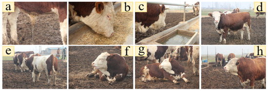 Several basic behaviors: (a) defecation, (b) feeding, (c) drinking, (d) standing, (e) walking, (f) ruminant (lying), (g) lying, (h) ruminant (standing).