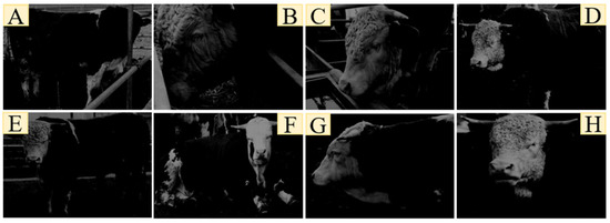 The video data acquired by the camera were delivered to the cloud with a resolution of 640 × 480 pixels. All captured cattle behaviors were used for training and testing, and different levels of occlusion were covered in the data because the actual distribution of the farm was used in the data acquisition process. In our data acquisition scenario, the video acquired through video surveillance undergoes a frame-splitting operation to transform it into frame images. We select both daytime and nighttime as distinct periods, from which we extract four video sequences. Each of these sequences provides a source of image data. To address the comprehensive spectrum of cattle behavior, encompassing eight fundamental behaviors, we meticulously curate 700 image data instances for each behavior. This meticulous approach not only establishes equilibrium within the dataset concerning behavioral categories but also bolsters the model’s generalizability and precision. To enhance the diversity and robustness of our training data, thereby fostering the model’s adaptability to diverse cattle behavior scenarios and elevating its generalization prowess, we employed the subsequent data augmentation methodologies within our dataset: