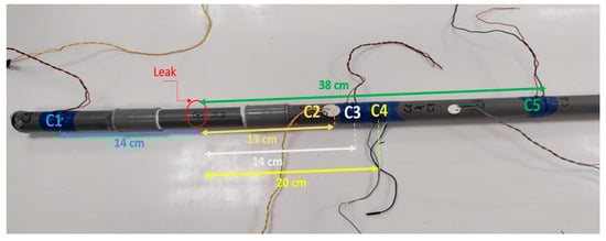 In Figure 2, we have an illustration of the experimental arrangement. This depiction showcases a plastic polyvinyl chloride (PVC) pipe with an outer diameter of 32 mm and a thickness measuring 3 mm, which is connected to the water supply network. Along the surface of the pipe, sensors were strategically positioned on both sides of the leak. We conducted experiments at three distinct flow rates, spanning from low to high. In order to establish the voltage signature of a pipe in good condition, we recorded the output from PVDF sensors for five minutes at each flow rate. To ensure the reliability and reduce the impact of occasional outliers, these tests were repeated three times, resulting in robust statistical data. In order to simulate various leak scenarios, we drilled four holes with different dimensions and shapes in four separate PVC pipe samples. For each unique leak and sensor condition, we carried out tests, resulting in a total of 180 tests. This comprehensive set of tests encompassed five sensor conditions, four leak sizes, three flow rates, and each individual test was replicated three times. To mitigate the challenges posed by high attenuation and acoustic dissipation, we made a deliberate choice to employ relatively short tubes, each measuring 2 m in length. This decision was guided by the intention to minimize the potential impact of acoustic dissipation, as discussed in reference []. We strategically positioned sensors at various points along these tubes. Our objective was to explore how the distance factor influences signal attenuation, primarily because of substantial acoustic dissipation into the flexible substrate, while also assessing the sensors’ sensitivity to detect leaks. Table 1 provides a comprehensive listing of the various sensors utilized for the detection of acoustic radiation, complete with their respective acronyms.