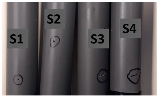 In our research, we conducted experiments using a diverse set of samples that incorporated holes of varying sizes and shapes. We achieved this diversity by employing drill bits with different dimensions. We intentionally introduced artificial leaks of differing dimensions and shapes into the pipe to assess how these factors influenced both the amplitude level and the frequency ranges of the acoustic signals. For clarity, you can find a comprehensive breakdown of these sample tube tests in Table 2, and a visual representation is provided in Figure 3. These tables and figures assign unique numerical identifiers, ranging from 1 to 4, to denote the specific conditions of each sample tube test. As an example, when you see “sample S1”, it signifies a leak with a diameter of 1 mm.