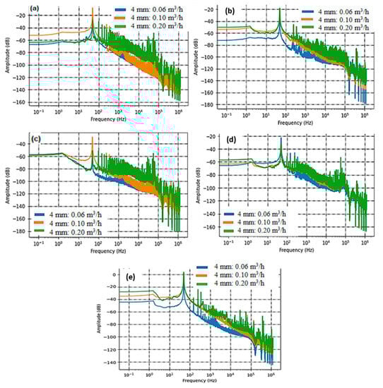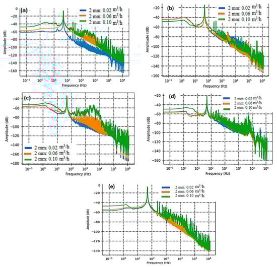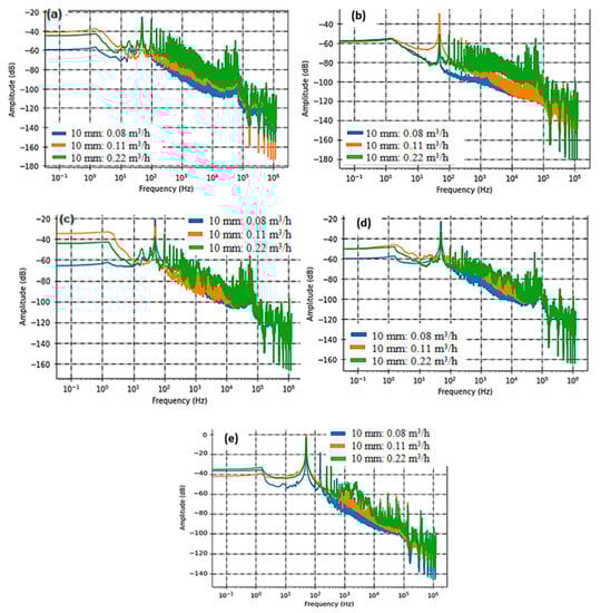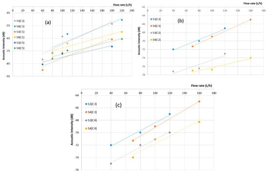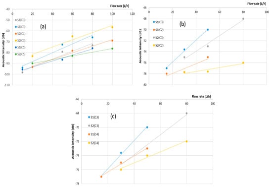 Sensor sensitivities reflect their capacity to perceive and react to alterations in the observed parameter or quantity. Essentially, sensitivity quantifies how much a sensor’s output shifts in response to a specific alteration in the input. The outcomes of our measurements, obtained within the frequency spectrum spanning from 80 Hz to 20 KHz, have been concisely summarized and are presented in the subsequent figures. These figures depict the acoustic intensity in relation to the flow rate for each sensor. This presentation method facilitates a straightforward visual assessment and facilitates the comparison of sensor responses across varying flow rate intervals.