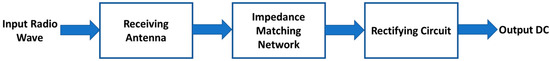 Electromagnetic energy harvesting relies heavily on rectifying antennas (rectennas), which can convert RF energy to DC power. The low-pass filter (LPF), diodes, and DC pass capacitor are the main components of the standard rectenna, as shown in the block diagram of Figure 1 [3]. The task of RF power harvesting is performed by converting sent/ambient RF electromagnetic waves into an AC signal through the receiving antenna. This AC signal is then rectified into DC which can be stored in batteries or used directly to drive a specific circuit.