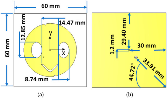 The antenna is etched on a 60 mm × 60 mm (i.e., ~0.5 λ × 0.5 λ) Roger RT/duroid 5880 substrate with a dielectric constant (εr = 2.2) and electric tangent loss (tan(δ) = 0.0009), which are more suitable for enhancing the radiation efficiency. Although a low dielectric constant is not good for radiation characteristics, especially with a thin substrate [16], the proposed antenna has demonstrated good performance, as presented in the next section. The slotted edge is useful for obtaining this advantage since it causes the input impedance of the antenna to be constructively matched with the port impedance.