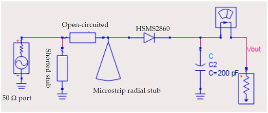To analyze the rectifier in the proposed rectenna system, the Harmonic Balance (HB) simulator was used due to the presence of the nonlinear Schottky diode (HSMS2860). HSMS2860 belongs to the HSMS-286x family of DC-biased detector diodes, which have been designed and optimized for use from 915 MHz to 5.8 GHz. The HSMS-286x family is ideal for RF/ID and RF Tag applications as well as large signal detection, modulation, RF to DC conversion, or voltage doubling. The electrical specification and spice parameter elements of this circuit are defined by the datasheet of the HSMS286x series in [36]. The circuit contains a series of transmission lines, a shorted stub, an open-circuited stub, and a microstrip radial stub between the 50 Ω port and the HSMS2860 diode.