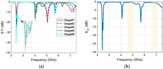 The reflection coefficient of (a) five design process stages and (b) final optimized stage.