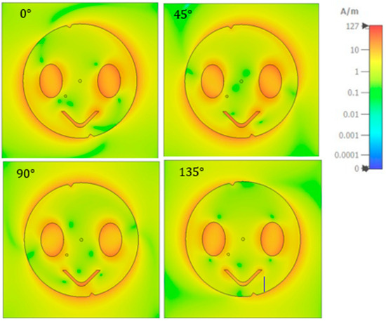 Figure 6 shows the current distribution of the proposed right-hand circularly polarized antenna at 2.45 GHz, which varies at different phases, indicating the counterclockwise movement of the surface current distribution at the edges. At all phases, the current distribution exhibits maximum amplitude at the symmetric oval slots, V-slot, and edges.