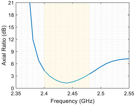 Figure 8 shows the axial ratio performance of a circularly polarized antenna over a specific frequency range from 2.35 GHz to 2.55 GHz. The axial ratio, which is a measure of the polarization purity of an antenna, is plotted as a function of frequency, with the relevant frequency range highlighted for clarity. The results show that the proposed antenna is circularly polarized around the 2.45 GHz frequencies. The antenna exhibits outstanding circular polarization purity with an axial ratio consistently less than 3 dB. The fact that the axial ratio remains very small over the entire frequency range of interest is a testament to the antenna’s exceptional performance and its ability to maintain the desired polarization state with minimal distortion. Consequently, the amount of captured power will be increased to match the circular polarization and be half the amount for linear polarization ambient EM waves.