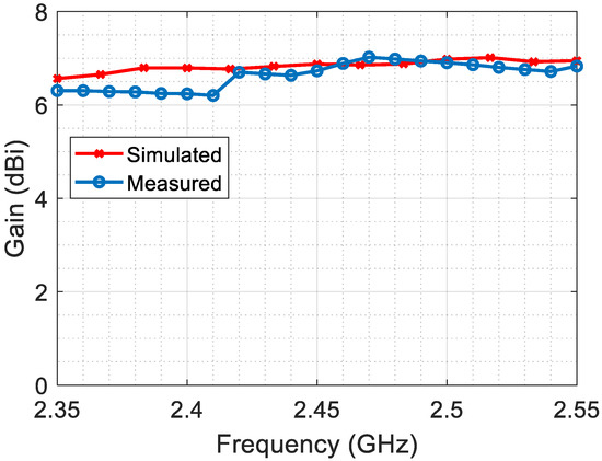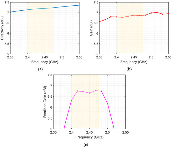 The co-polarized directivity pattern of the proposed antenna at the studied frequency is shown in Figure 9. The maximum directivity is around 7.2 dBi in the main lobe of the center operating frequency, 2.45 GHz. The radiation pattern is unidirectional and symmetric in both the azimuth and elevation planes, with no significant side or back lobes. The plot of directivity with frequency variation in the same main lobe direction is shown in Figure 10a. The directivity of the antenna indicates its ability to concentrate radiation in a specific direction. However, directivity alone is not sufficient for a complete understanding of the antenna’s performance. To assess its effectiveness, it is important to consider the gain and realized gain as well. Gain refers to the ratio of the power radiated by the antenna in a specific direction to the power that an ideal isotropic antenna would radiate, assuming the same input power. It quantifies the antenna’s ability to efficiently radiate energy in a specific direction.