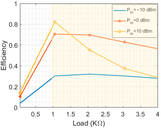 The overall efficiency of the energy harvesting system is affected by various factors, including the resistive load of the rectifier. Figure 12 shows the effect of changing the resistive load of the rectifier on the output DC power. Electromagnetic energy harvesting is utilized in various applications, including wireless sensor networks, RFID systems, energy harvesting power supplies, medical implants, and environmental monitoring systems. The input impedance of these applications varies, with wireless sensor networks typically ranging from 1 kΩ to 10 kΩ, RFID systems ranging from 50 Ω to 100 Ω, and others typically ranging from 1 kΩ to 100 kΩ [37]. The results of this work indicate that the DC power is stable in the range of 1 KΩ to 4 KΩ resistive load rectifiers for practical input AC power levels (−10 dB to 0 dB), which makes it a suitable candidate to support wireless sensor networks, energy harvesting power supplies, medical implants, and environmental monitoring systems.