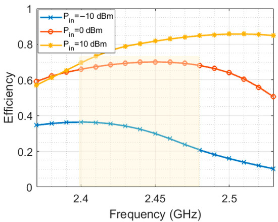 In addition to the resistive load, the energy harvesting performance also varies with the input AC power level and operating frequency. Figure 13 shows the AC-to-DC conversion efficiency for frequencies in the ISM band at three different input AC power levels. The results indicate that the efficiency is within the range of 20% to 75% for the targeted bandwidth and different input power levels ranging from −10 dBm to 0 dBm.