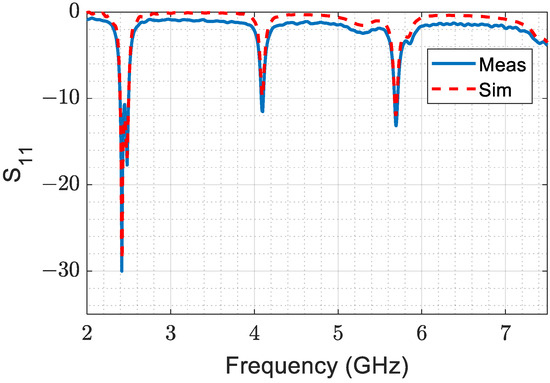 The fabricated antenna and vector network analyzer system are shown in Figure 15. Figure 16 presents a comparison between the measured and simulated S11 values of the designed antenna, which indicates good agreement between the simulation and measurement results. This agreement confirms that the designed antenna is highly accurate and reliable.