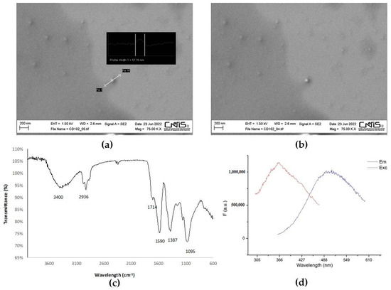 Characterization of electrochemically synthesized CDs: (a,b), scanning electron microscopy (SEM) images; (c) IR spectrum (ATR mode); (d) fluorescence excitation (red line) and emission (blue line) spectra (CDs, 2 mg/mL).
