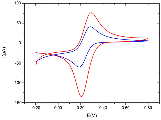 A diffusion-controlled process was observed for the redox probe at all the electrodes, as supported by linear plots of Iap vs. v1/2 (where Iap is the peak current intensity and v is the scan rate in the range 0.02–0.50 V s−1), which is in agreement with literature findings for nanostructures [34,35].