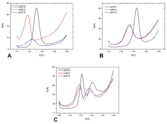 Within the pH range 0.4–7, the Ep values of CAF (+1.49 V, Table 2) and THEO (+1.25 V, Table 3) decreased about 0.1 V for increasing pH, indicating that protons are involved in the oxidation mechanism. DPVs at CDs-CS-GCE of THEO 5 × 10−3 mol L−1 (A), CAF 5 × 10−3 mol L−1 (B) and CAF + THEO, both 5 × 10−3 mol L−1 in the ratio 1:1 (C), at three different pH values, namely 0.4, 5 and 7, are shown in Figure 3.