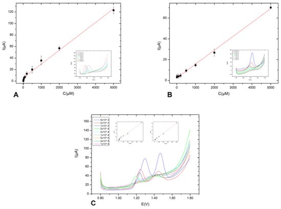 Calibration curves of (A) THEO, (B) CAF and DPV profiles of (C) THEO + CAF in the concentration ratio 1:1, in 0.4 mol L−1 HClO4, concentrations range 1 × 10−5–5 × 10−3 mol L−1, at CDs-CS-GCE, by DPV measurements (step potential 0.004 V, modulation amplitude 0.025 V, modulation time 0.05 s, scan rate 0.02 V s−1, vs. Ag/AgCl).
