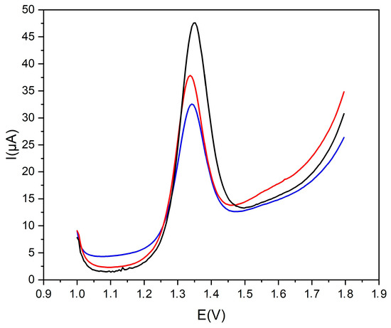 The matrix effect (ME) was evaluated by adding known concentrations of THEO standard solution (1 × 10−3 mol L−1 and 4 × 10−3 mol L−1) to sample S4. DPVs recorded at CDs-CS/GCE on the starting drug solution and after the addition of known amounts of THEO are shown in Figure 5.