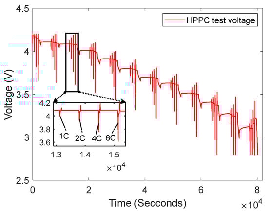 We use the LG 18650HG2 lithium-ion battery data from McMaster University to obtain the relationship between and the SOC, and to carry out the parameter identification of the second-order RC model [28]. Figure 2 shows the HPPC test voltage response curves from these data for a four-pulse discharge HPPC test at 12 different SOC values. The four pulses are 1C, 2C, 4C, and 6C discharges.