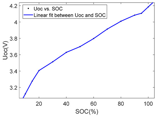 It can be seen from Figure 3 that the part of the SOC between 20% and 90% is approximately a straight line. A similar view is also presented in the paper [30]. That is, in the middle segment of the relationship between and the SOC, it can be regarded as a linear relationship.