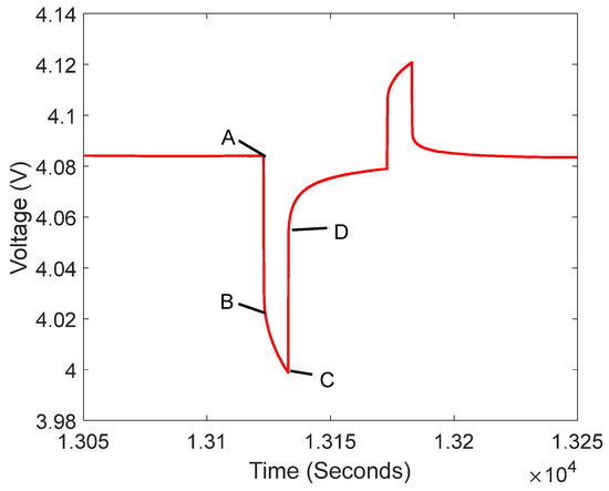 A, B, C, and D in Figure 4 are the points where the voltage curve changes the shape. From the second-order RC equivalent model, it can be seen that the sudden drop in voltage at the start of discharge is the effect of the internal resistance , which is shown in Figure 4 for segment AB and, similarly, the rapid rise in voltage at the end of discharge is a function of , which is shown in Figure 4 for the segment CD. However, the phenomenon of the gradual voltage drops during discharge, which is shown in Figure 4 for segment CD, can be explained due to the RC network. Therefore, we can obtain the value of the ohmic internal resistance of the battery from the AB and CD segments, and the value of from the BC segment. Here, is calculated via (10):