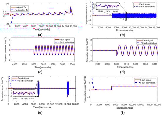 The PD observer (21) applied to the fault estimation of the temperature sensor fault: (a) the observation of state by observer (21) when there is no fault; (b) the estimated results when the time-varying fluctuation fault occurs at 5000 s; (c) the estimated results when the time-varying fluctuation fault occurs at 5000 s; (d) the estimated results when the time-varying fluctuation fault occurs at 5000 s; (e) the estimated results when the intermittent fault occurs at 7000 s and 14,000 s; (f) the estimated results when the bias fault occurs at 5000 s.