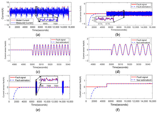 The PD observer (21) applied to the fault estimation of voltage sensor: (a) comparison of the model current and measured current; (b) the estimated results when the time-varying fluctuation fault occurs at 5000 s; (c) the estimated results when the time-varying fluctuation fault occurs at 5000 s; (d) the estimated results when the time-varying fluctuation fault occurs at 5000 s; (e) the estimated results when the intermittent fault occurs at 7000 s and 14,000 s; (f) the estimated results when the bias fault occurs at 5000 s.