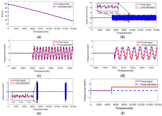 The PD observer (22) applied to the fault estimation of the voltage sensor: (a) the observation of the SOC by the observer when there is no fault; (b) the estimated results when the time-varying fluctuation fault occurs at 5000 s; (c) the estimated results when the time-varying fluctuation fault occurs at 5000 s; (d) the estimated results when the time-varying fluctuation fault occurs at 5000 s; (e) the estimated results when the intermittent fault occurs at 7000 s and 14,000 s; (f) the estimated results when the bias fault occurs at 5000 s.