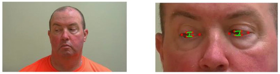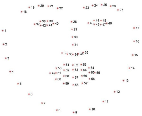 Once the bounding box of the face is detected, key facial landmarks were required to monitor the patient’s facial features, which would be the foundation of our segmentation and analysis to evaluate ptosis and ocular misalignment. For facial alignment, many methods exist. Some of these image-based techniques were reviewed by Johnston and Chazal [29]. One of the most time-efficient for real-time application is based on the shape regression approach [30]. We used DLib’s implementation of the regression tree technique from V. Kazemi and J. Sullivan [31], which was trained on the 300 W dataset [32] fitting a 68 points landmark to the face (Figure 3 and Figure 4). The ROI for each eye is the polygon formed by points 37 to 42 for the right eye, and 43 to 48 for the left eye, in reference to the model in Figure 3.