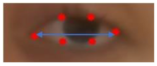 Eye Opening distance (blue arrow) and eye area (in green), obtained from the machine learning landmarks (red dots).