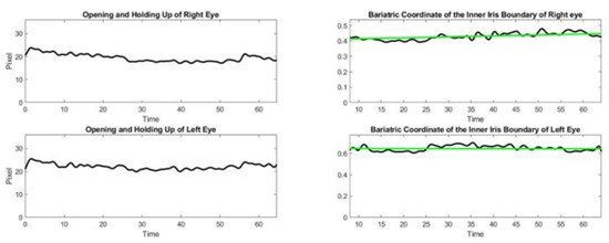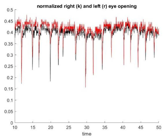 In principle, Pleft and Pright should be of the same order, as the subject is looking straight at the camera; αleft and αright should also be strongly corelated, as the subjects direct their gaze horizontally. As fatigue occurs, the difference between αleft and αright should change with time and correspond to the misalignment of both eyes. We assume that diplopia occurs when the difference between αleft–αright deviates significantly from its initial value at the beginning of the exercise.